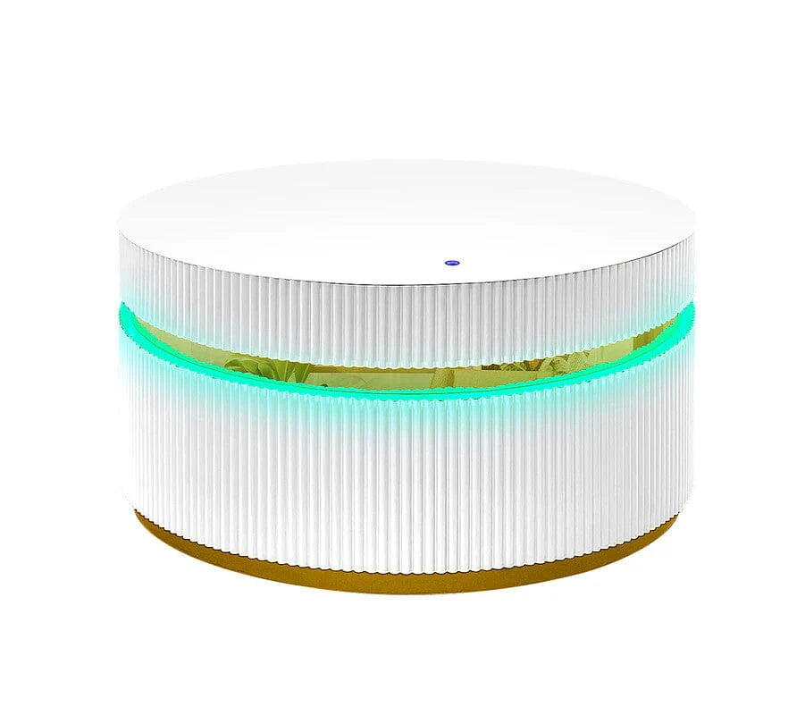 طاولة قهوة دائرية 39 بوصة باللون الأبيض مع سطح زجاجي وإضاءة LED.
