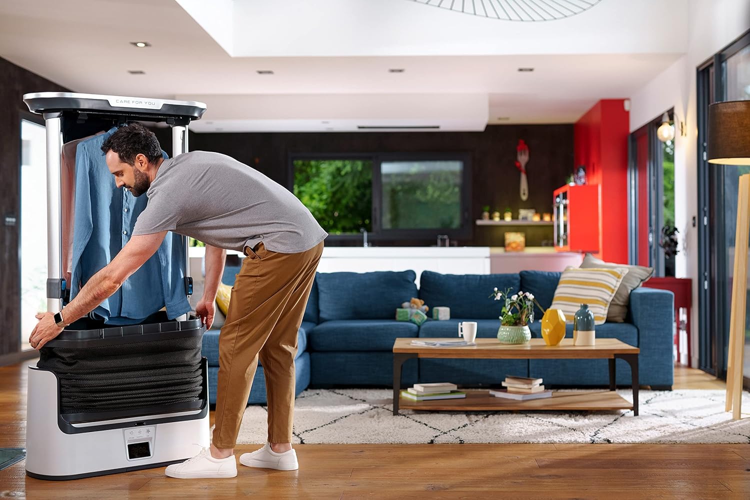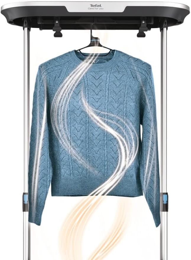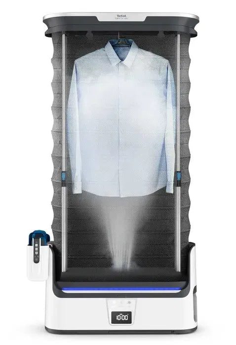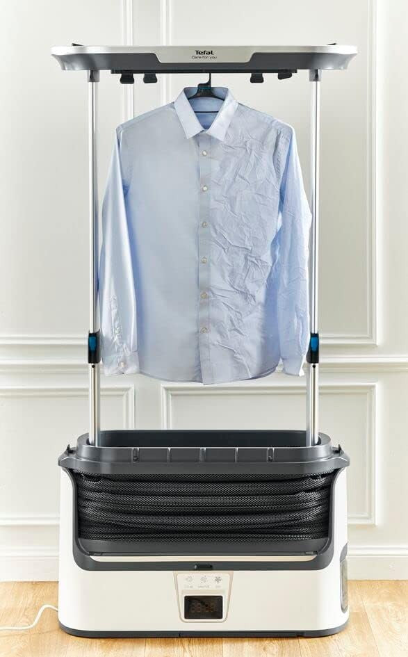 Care For You garment steamer from Tefal that harnesses the power of natural steam to remove wrinkles, sanitize and dry with an automatic process that makes caring for clothes a breeze. See your everyday life change with the ultimate steam solution that revitalizes your clothes without any special effort, just place up to 3 pieces on the hangers and in just a few minutes they will be ready. In addition, Care for You is ideal for any type of fabric and has an extremely silent operation. Plus, its stable base offers you safety when the ironing system is in use, while the easy-to-read screen and remote control offer even greater ease of use.