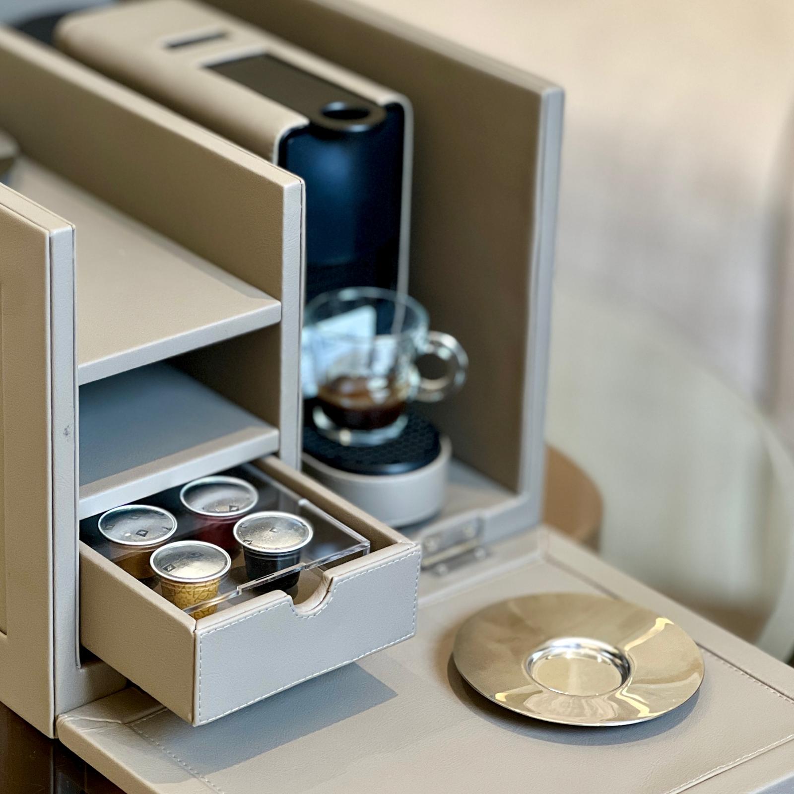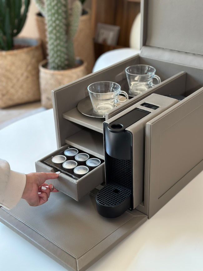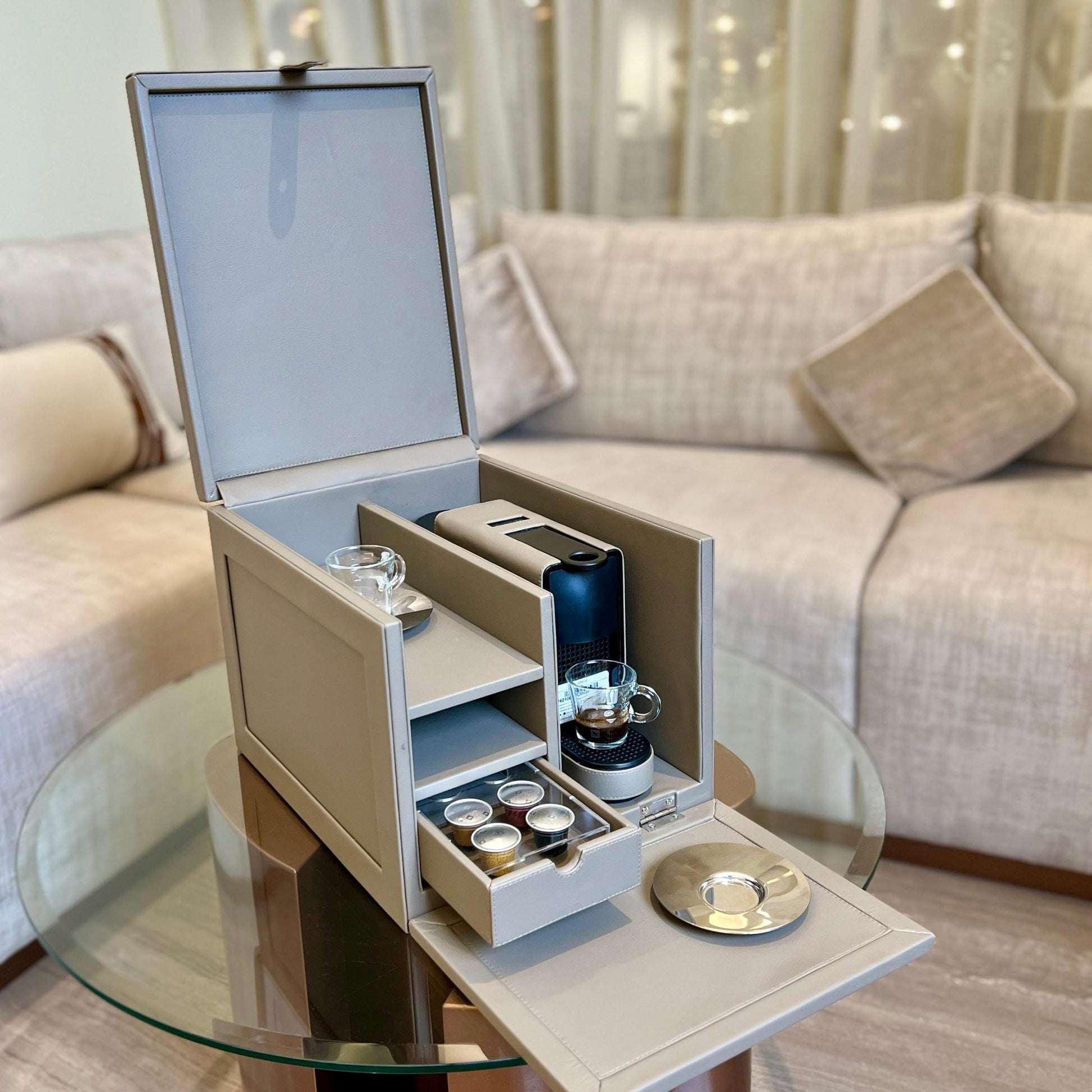 Elevate your coffee moments with this luxurious beige espresso machine, elegantly packed in a premium leather case – perfect for personal use or as a refined gift.