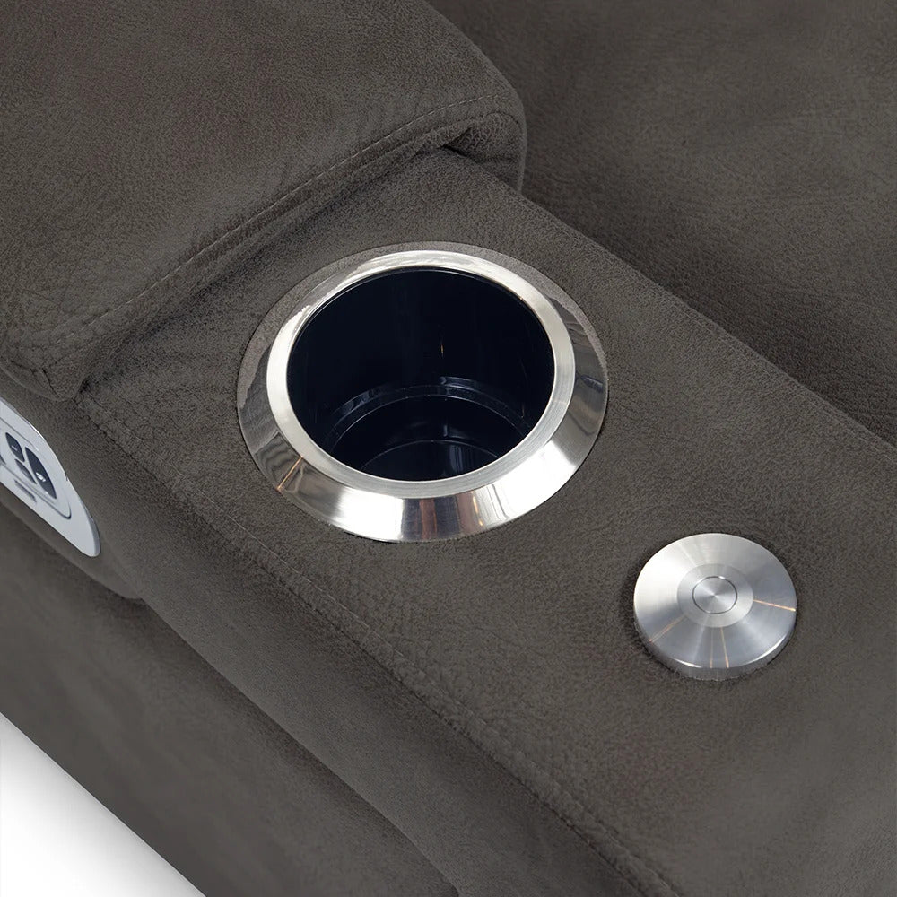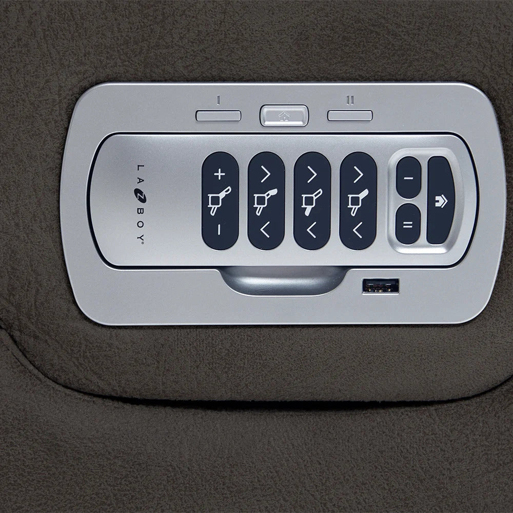 - Arms outfitted with a silver cupholder, accessory grommet, and wireless charging tray
